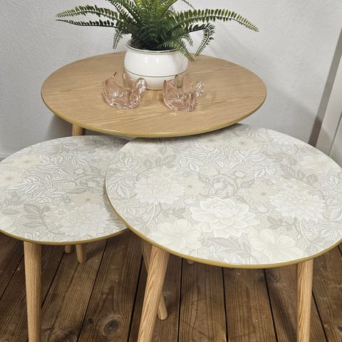 Soffbord och 2 sidobord i trä i klassisk design med svarvade ben. Mycket fint skick.