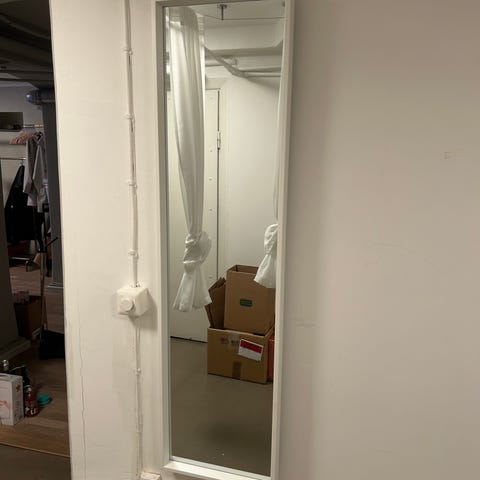 IKEA Spegel med svart ram. Spegeln kan både monteras som vanligt på krok/spil eller med hjälp av gångjärn för extra förvaring bakom.