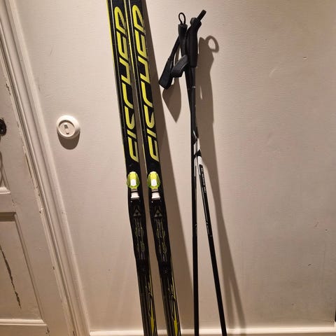 Vallningsfria Fischer SL Pro längdskidor längd 200 cm med SNS-bindning. Stavar 150 cm.