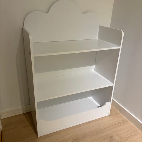Jollyroom barnmöbler bestående av ett barnbord och en stol i vitt. Bordet och stolen är tillverkade i trä och har en enkel design med stjärndetaljer på stolens ryggstöd. Passar för barn och kan användas för olika aktiviteter såsom lek och pyssel.