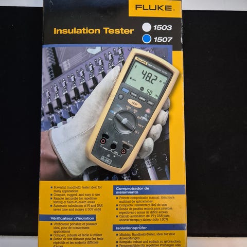 Fluke 12 multimeter med digital display och flera funktioner för mätning av elektriska värden. Inkluderar testkablar för anslutning.