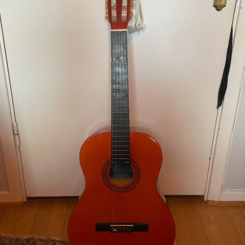 Cataluña SGN-C81 akustisk gitarr tillverkad i Kina. Gitarren har en klassisk design med nylonsträngar och en naturlig träfinish. Den levereras med ett mjukt fodral för skydd och transport. Noter ingår.
