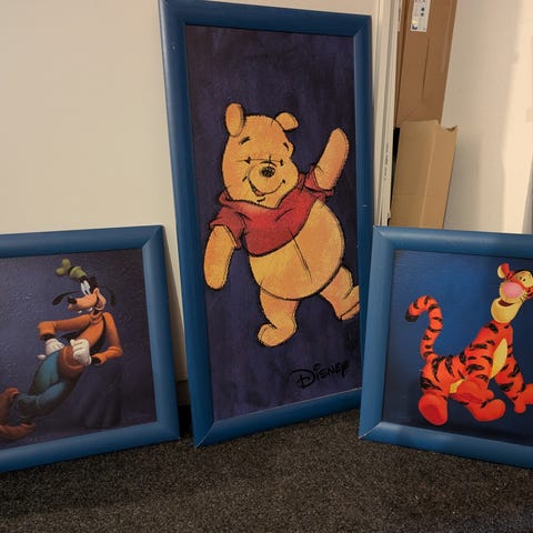 Tavla med motiv av fåglar och hus i färgglad design, inramad med vit trä ram. Super söt inredning för barnrummet.