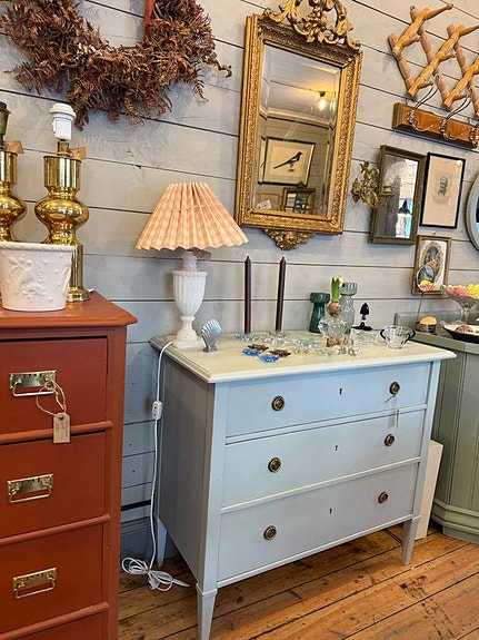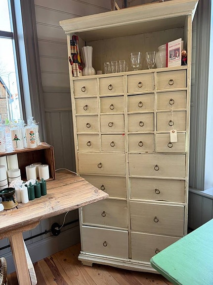 Fint trärent gammalt överskåp med vitrindörrar måste fästas i vägg