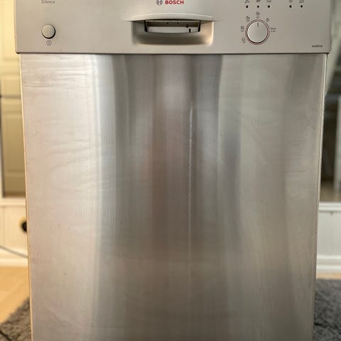 Bosch integrerad diskmaskin med standardstorlek och vit färg. Diskmaskinen har en frontpanel med kontrollknappar och display, samt inredning med korgar för bestick och tallrikar. Designad för att integreras i köksskåp.
