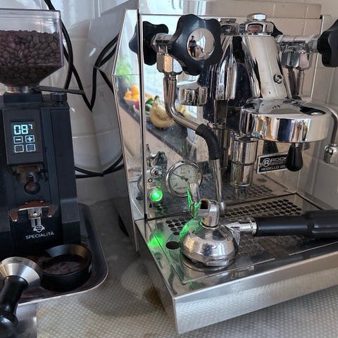 Detta är en traditionell manuell espressomaskin för malet kaffe som verkligen ger känslan av espresso på den italienska rivieran.