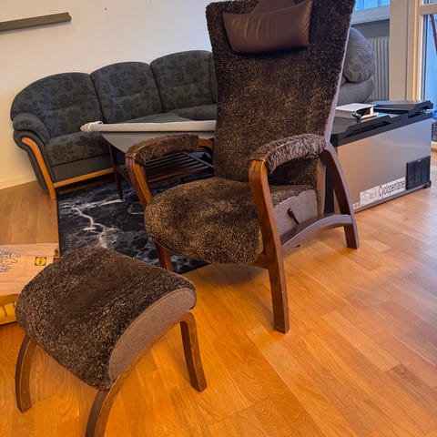 Bröderna Andersson Patronen fåtölj med fotpall – fårskinn