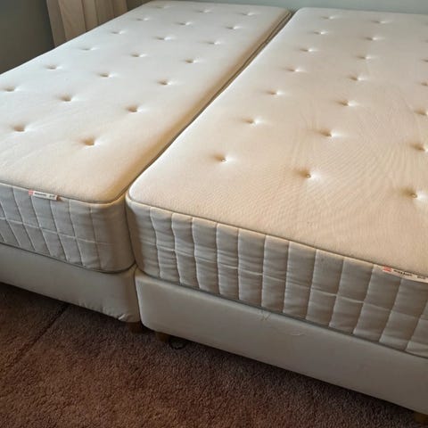 Säng 180cm x 200cm kontinental ikea med sänggavel. Fast hårdhet hokkåsen. Bra skick. Ljusgrå. Pris 1300kr
