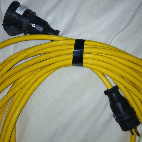Raptor Förlängningskabel med en längd på 25 meter och svart färg. Produkten har flera uttag och är avsedd för elektrisk anslutning och förlängning av elkablar.