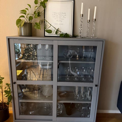 Havsta vitrinskåp från Ikea. Grå färg. Fint skick! Kan användas som överskåp till Havsta serien eller som separat skåp.