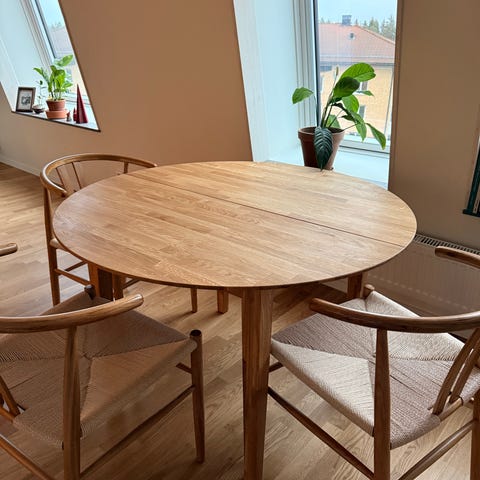 Stabilt och snyggt matbord för 2-4 personer i massiv ek, vitpigmenterad. Bordet har en fällbar klaff som hålls upp av två reglar (som dras ut).
