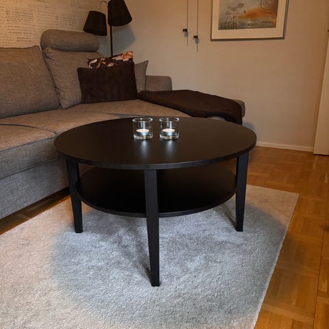 Soffbord med kakelplattor på ytan och trästomme. Bordet har en förvaringshylla under bordsskivan. Passar för vardagsrum och liknande utrymmen.
