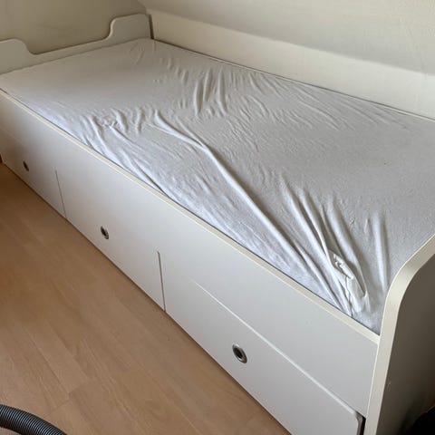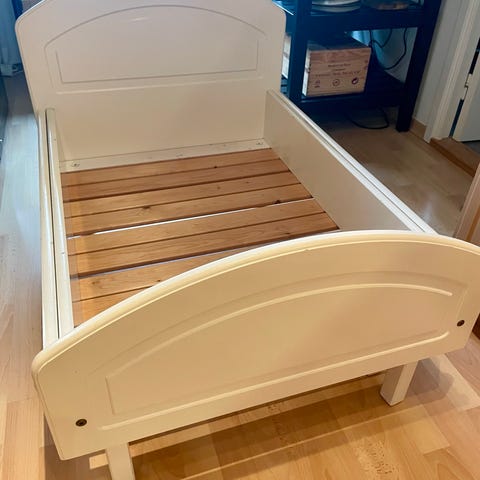 Barnsäng 90×200 cm. Sängen är byggd av stomme från Ikea KURA.