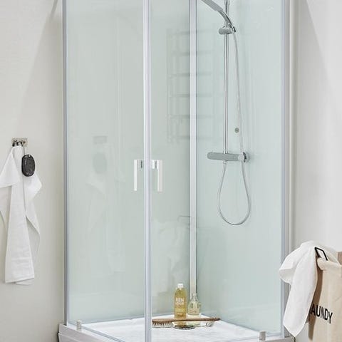 Luftig och stilren duschkabin med raka dörrar i klarglas. De stora glasdörrarna ger duschen ett elegant uttryck samtidigt som det skapar en generös dörröppning.