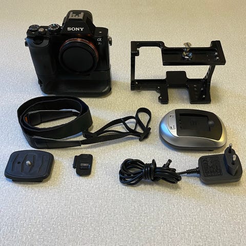 Sony AX7s systemkamera med 2st batterier och laddare. Sony Zeiss objektiv FE 4/16-35 mod SEL1635Z, lampa med brutet fäste, 3st stativ samt bakgrundsstativ
