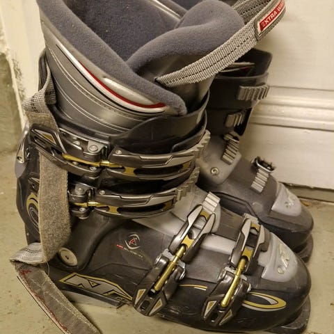 Nordica pjäxor i rött, grått och svart. Storlek: 22.5 (Mondopoint), vilket motsvarar ungefär storlek 35–36 i vanliga skor.