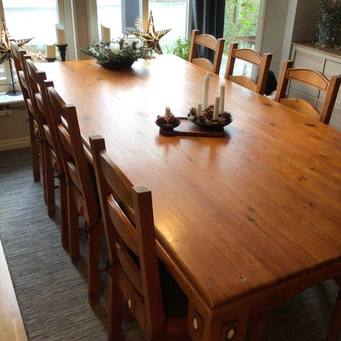 Matbord i sk. återvunnet trä ( vad de nu är?). Ser rustikt ut men är faktiskt inte så tungt.