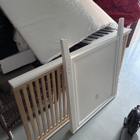 Jollyroom Juniorsäng i vit trä. Sängen är utformad för barn och har ribbotten för madrassstöd. Passar som övergångssäng för barn från spjälsäng till vanlig säng.