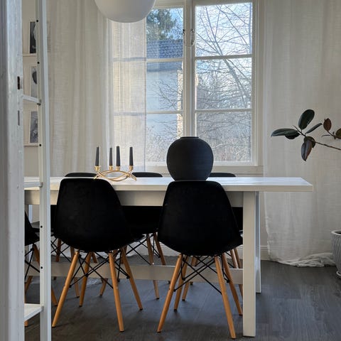 Säljer 4st matstolar från Ellos i fint skick! Beige/grå färg med svarta ben. Säljer alla 4 för 2500kr. Nypris 4080kr. Hämtas i Årsta!