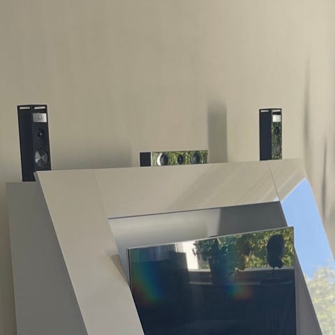 Samsung högtalarsystem med fyra tornhögtalare och en subwoofer. Systemet är svart och avsett för ljudanvändning i hemmiljö.