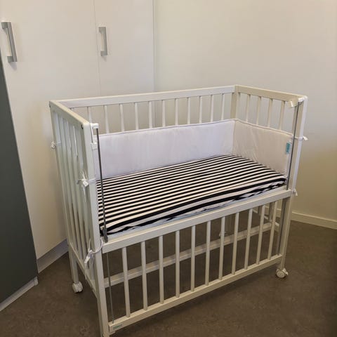 Stilren och smart Bedside Oslo från Troll Nursey som kan användas både som fristående säng eller ställas mot en större säng så man kan ligga nära barnet på natten. Sängen är tillverkad av björk och har en sängbotten som är ställbar i tio olika lägen (bäddhöjd 59 cm - 74 cm (utan hjul) + 6 cm med hjul.). Långsidan har en dropside funktion och kan fällas till hälften för att matcha vuxensängen.