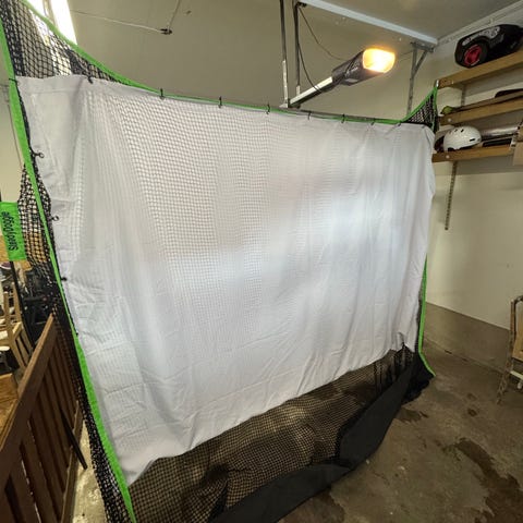 Golfsimulator med tillhörande matta.