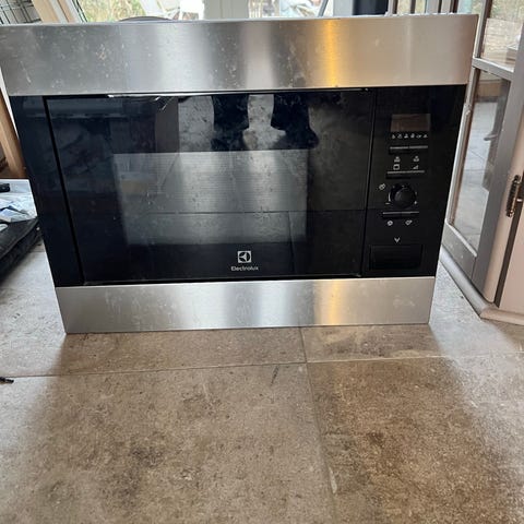 Samsung mikrovågsugn i färgen stål/silver med svart lucka och panel.