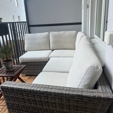 Vit utemöbel från Hillerstorp. Allting helt/funktionsdugligt. Behöver målas. Inga dynor. Säljes pga flytt.