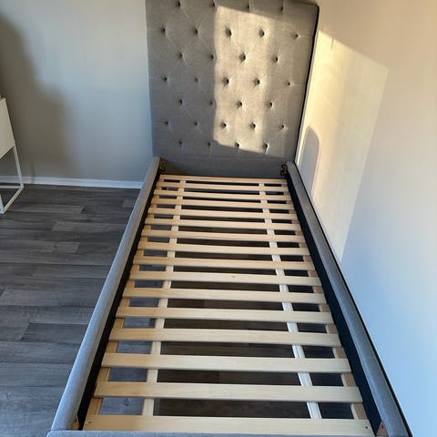 Fin säng i ljust trä från Jotex. Viljo heter modellen och den är köpt för prick 2 år sen.