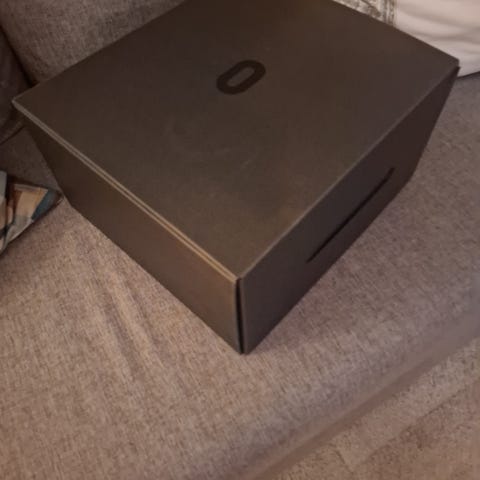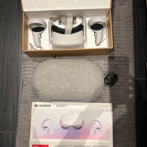 Oculus Rift S VR-headset med tillhörande handkontroller och kablar. Enheten är svart och inkluderar USB- och HDMI-kablar för anslutning. Headsetet är utformat för virtuell verklighet och används tillsammans med handkontroller för interaktion i VR-miljöer.
