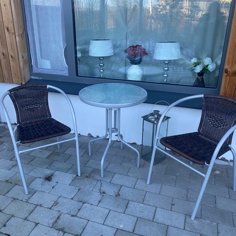 Bord och 4 stolar i konstrotting och trä. Fint skick.
