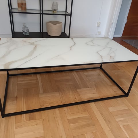 Vitt/grått soffbord i marmor med svart underrede, modell Parga från Mio.