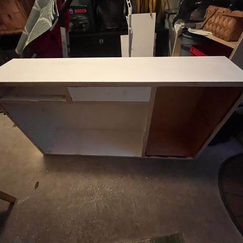 Skåpsskivan har med åren fått några fläckar och en av de små lådorna sitter snett (se bilder). Lätt fixat för den händige. Men också fullt användbar som den är.