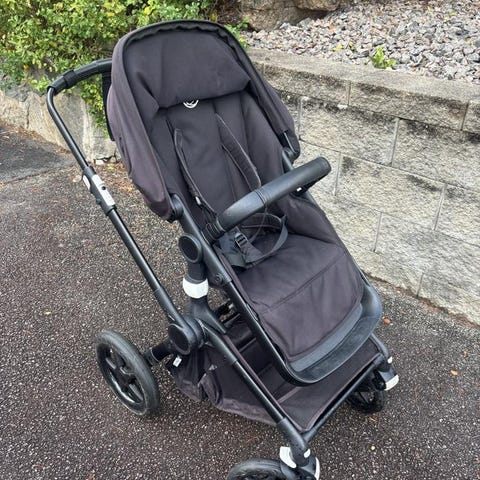 Bugaboo barnvagn i svart färg. Vagnen har en robust ram med fyra hjul och en justerbar sufflett. Sittdelen är utrustad med säkerhetsbygel och vadderad sits. Vagnen kan användas med liggdel för spädbarn. Handtaget är justerbart för olika höjder.