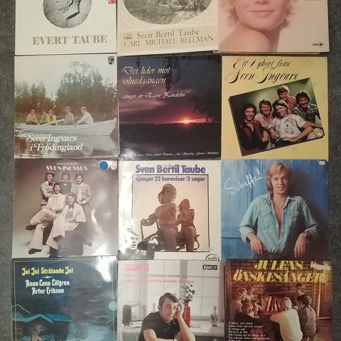 Ett varierat urval av vinylskivor med svenska och internationella artister. Inkluderar inspelningar av Evert Taube, Sven Bertil Taube, Lill Lindfors, Jan Lindblad, och andra. Perfekt för samlare eller musikälskare som vill utforska olika genrer och artister.