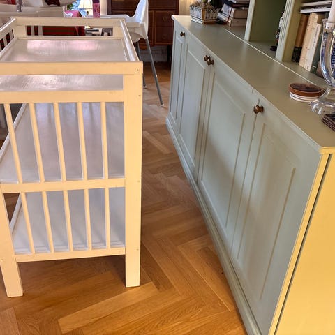 IKEA skötbord i vit färg. Tillverkad av trämaterial.