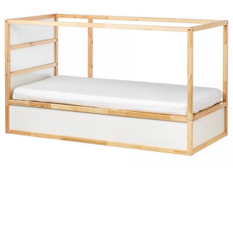 IKEA KURA vändbar barnsäng. Sängen har en ram i furu med vitmålade paneler.