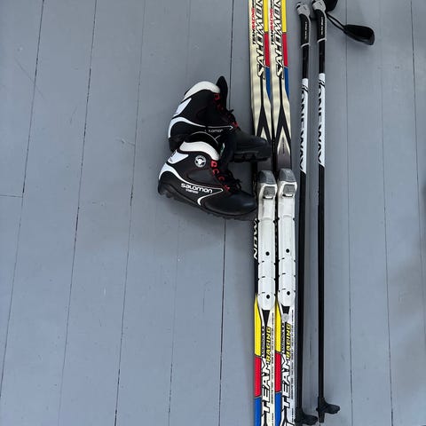 Längdskidor Salomon 131 med stavar och pjäxor.