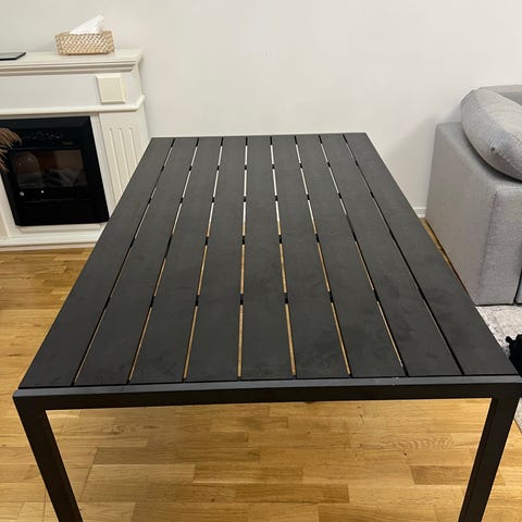 IKEA VIHOLMEN trädgårdsbord/utebord med måtten 135x74 cm. Bordet är mörkgrå/svartgrå och tillverkat i stål. Designat för utomhusbruk med en robust konstruktion och hål i bordsskivan för parasoll.