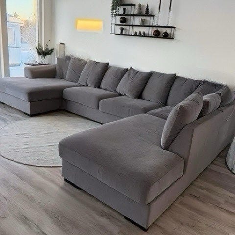 Soffan är i grå färg, väldigt bra skick, inga repor slitage eller fläckar, hela soffan är ångtvättad samt alla kuddarna är tvättade med.