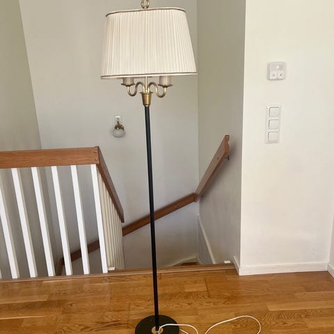 Golvlampa från 50-talet. Elektroniken fungerar. Behöver putsning, har något blekt tyg. I bruksskick för sin ålder. Hämtas i Nyköping.