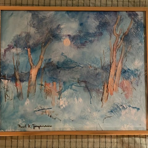 Målningen är signerad Larzon –48, vilket sannolikt kan avse den svenske konstnären Arne Larzon (1914–2000), känd för sina natur- och landskapsmotiv. Jag kan dock inte garantera att det är han, men stilen påminner om hans tidigare verk.