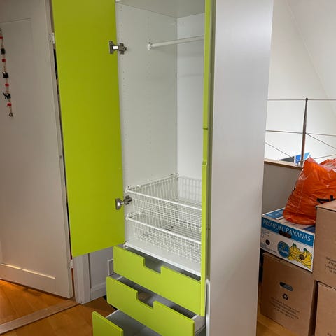Öppen stilren förvaring för barn. Vi har använt den till utklädningskläder. Galgar ingår om man vill.