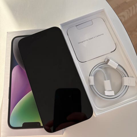 Apple iPhone 14 mobiltelefon med 128 GB lagringskapacitet i svart färg. Enheten visar tecken på användning med märken och slitage på kanter samt en mindre repa på skärmen.