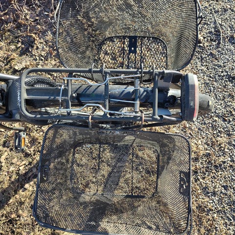 En cykel korg med lokgaller på som passar bra till små djur som hänga med på en cykel tur , loken är i metall och korgen i hand verk trä grenar , har inlägg liten mjukt matta , enligt på bilder finns i Västerås .