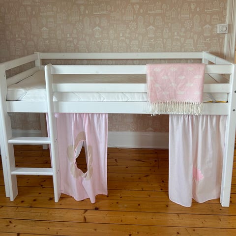 Hoppekids Loftsäng, vit. Sängen är tillverkad i trä och är anpassad för att ge extra utrymme under sängen för lek eller förvaring. Sängen kan även användas som en vanlig säng om så önskas. Sängen är fullt fungerande, men har några mindre skavanker, se bilder. Passar med madrass 90×200. Madrass och bäddmadrass ingår vid snabb och smidig affär. Snabb upphämtning prioriteras.