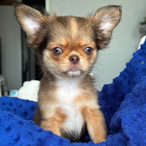 Nu finns det 3st otroligt fina chihuahua valpar att boka och följa. Det är 1 hane samt 2 tikar kvar. Alla blir långhårig då båda föräldrarna är det. Mammans syskon samt mammans pappa är blue merle, så det finns i ledet. Valparna kommer vara mycket social och framåt. Både mamman och pappan är fullt friska med ett otroligt fint psyke. Valparna säljs utan stamtavla. Valparna är 8v och leveransklara den 1/2-26. Dom kommer då att vara: