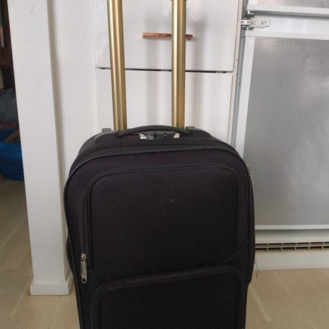 Resväska med hjul och handtag i brun färg. Tillverkad av textilmaterial med detaljer i konstläder. Utrustad med ett teleskophandtag och bärhandtag för enkel transport. Det är inte några fel.på.hjulen och handtaget går lätt att få upp och ner , har dock lite skada på handtaget som lagats och som inte påverkar funktionen.
