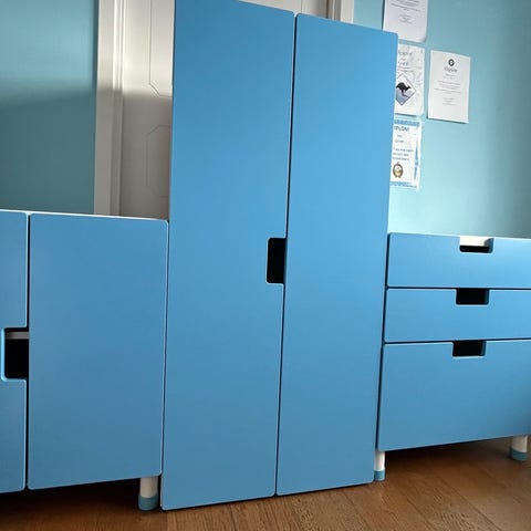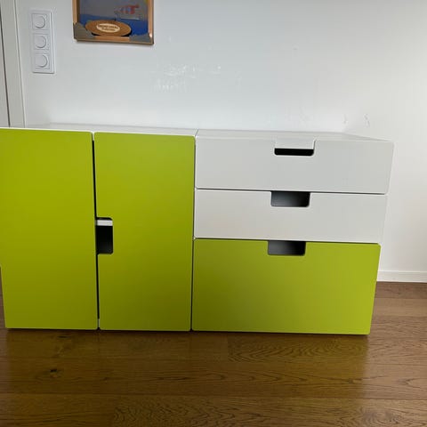 IKEA barnmöbler förvaring i vit färg. Består av tre moduler med skåp och lådor i olika storlekar för att organisera och lagra barnens saker. Möblerna är designade för barnrum och erbjuder praktiska lösningar för förvaring.