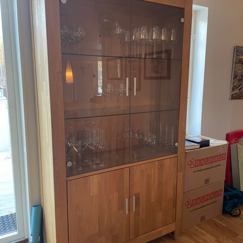 Högt vackert vitt vitrinskåp med glas även på kortsidorna och 6 hyllplan.